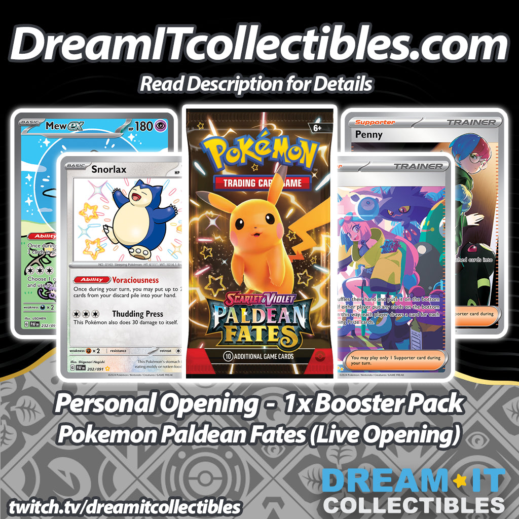 The Item for sale is featured live opening on: https://www.twitch.tv/dreamitcollectibles